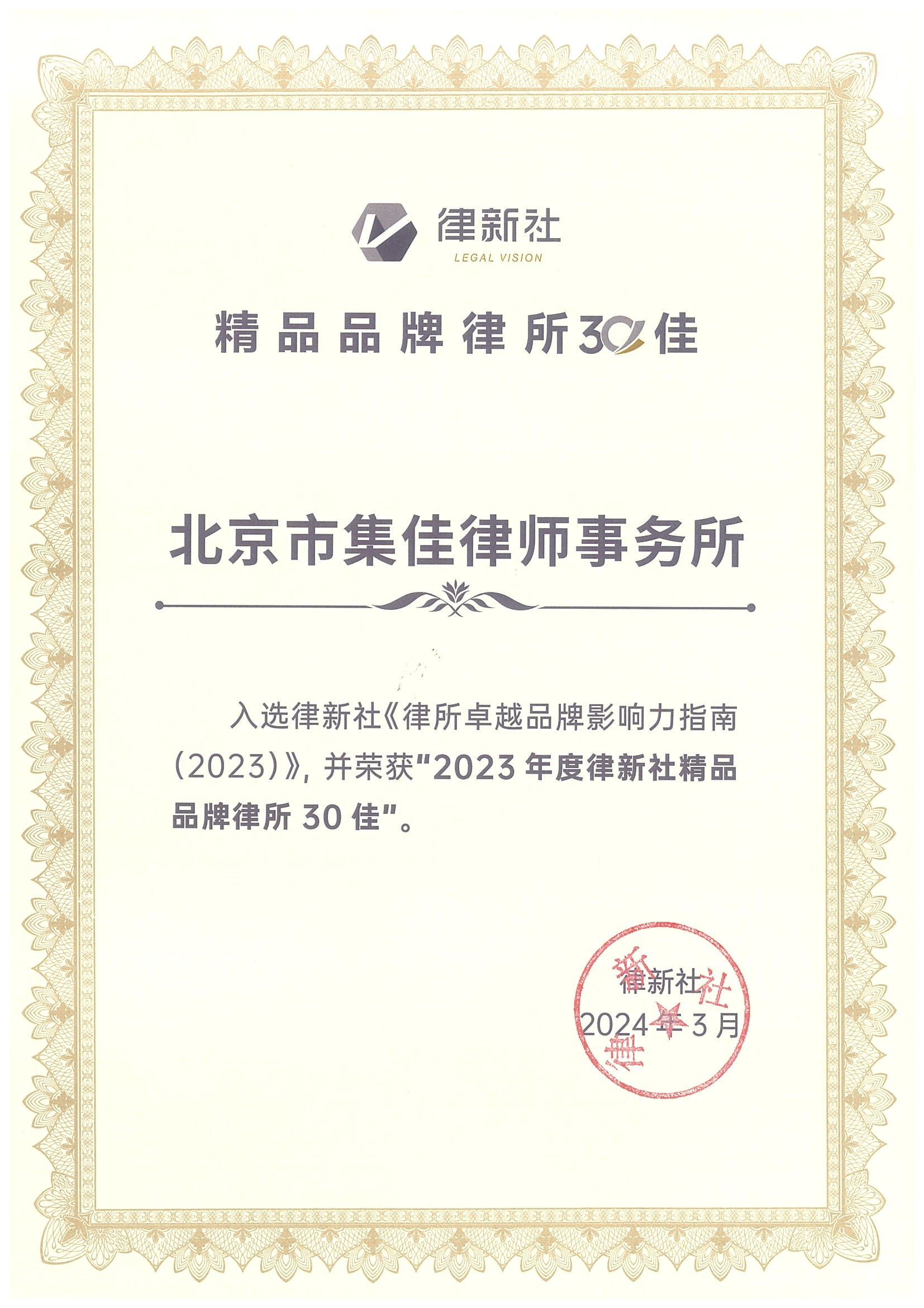 >开云>关于我们>荣誉概览>2024>开云入选 “2023年度律新社精品品牌律所30佳”