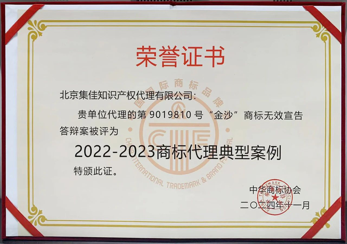 >开云>关于我们>荣誉概览>2024>集佳代理的“金沙”商标权无效宣告答辩案入选“2022-2023商标代理典型案例”