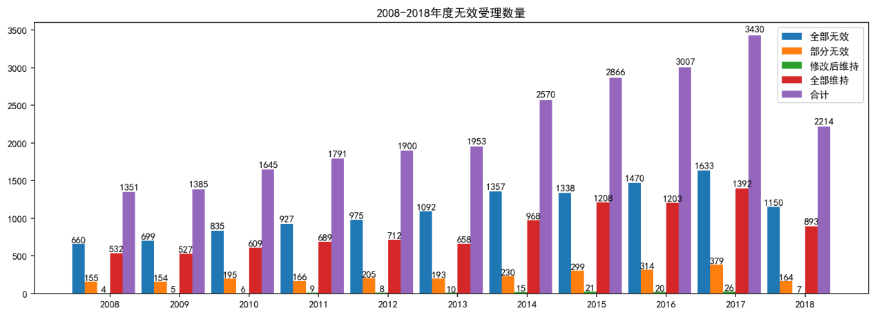 需要指出的是,2018年的数据目前看起来较少,很可能是因为还存在很多尚未完结的案件,因此不能简单地认为2018年的无效请求数量下降。